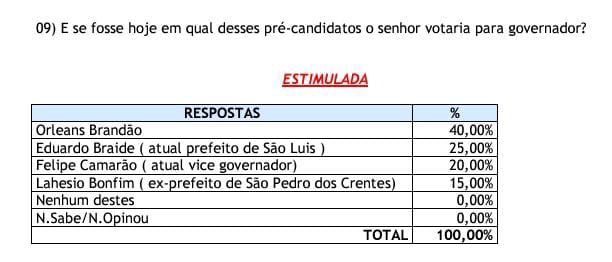 No município de São Domingos do Maranhão, pesquisa do Instituto Nacional de Opinião Pública (Inop Previsão) aponta que o secretário de Assuntos Municipalistas, Orleans Brandão (MDB) tem a preferência do eleitorado, com 40% das intenções de voto.